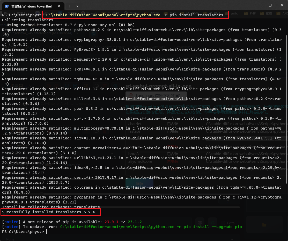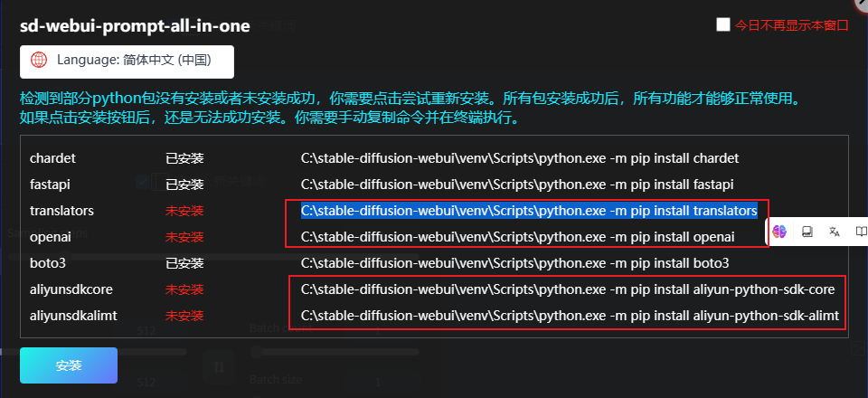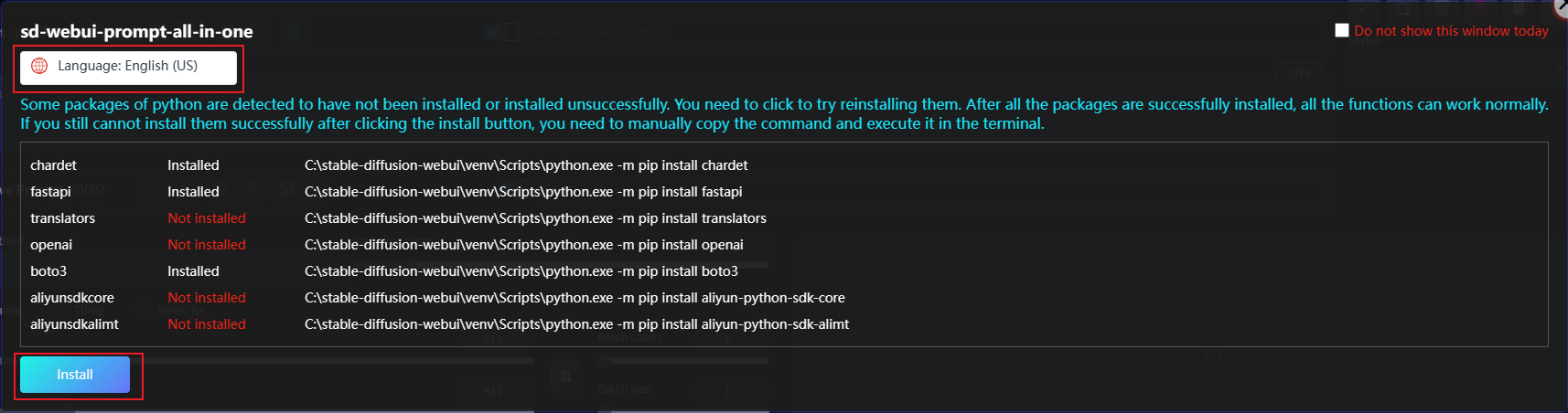 В некоторых случаях после установки и перезагрузки WebUI пакеты Python, необходимые для работы данного расширения, могут не установиться автоматически. В этом случае расширение выведет окно установки, и вам нужно будет установить их вручную.