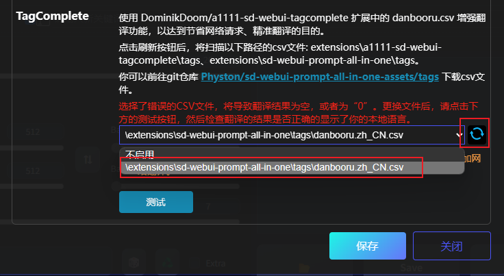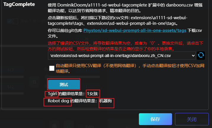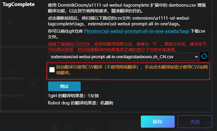 Включить CSV-файл в a1111-sd-webui-tagcomplete для улучшения функции перевода.