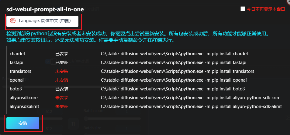 在某些情况下,安装完成并重启 WebUI 后,本扩展所需的 python 软件包可能无法自动安装。这时候本扩展会弹出安装窗口,你需要手动安装。
